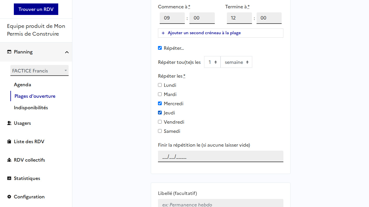 J'ouvre le menu des plages d'ouvertures pour renseigner mes disponibilités
