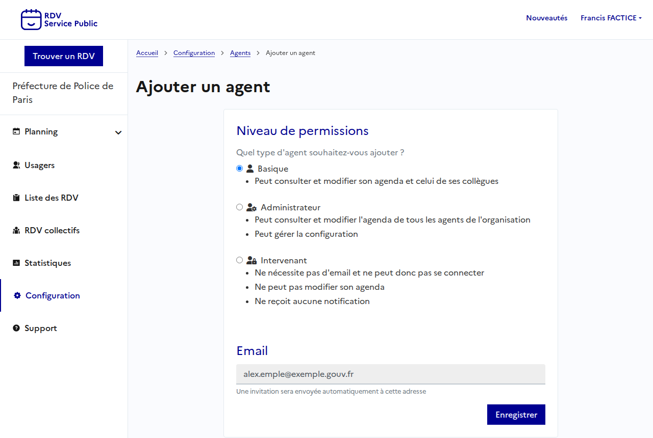 Cet agent ne fera que planifier des rendez-vous, donc je laisse le niveau de permission à Basique. J'indique sont adresse email et j'enregistre.