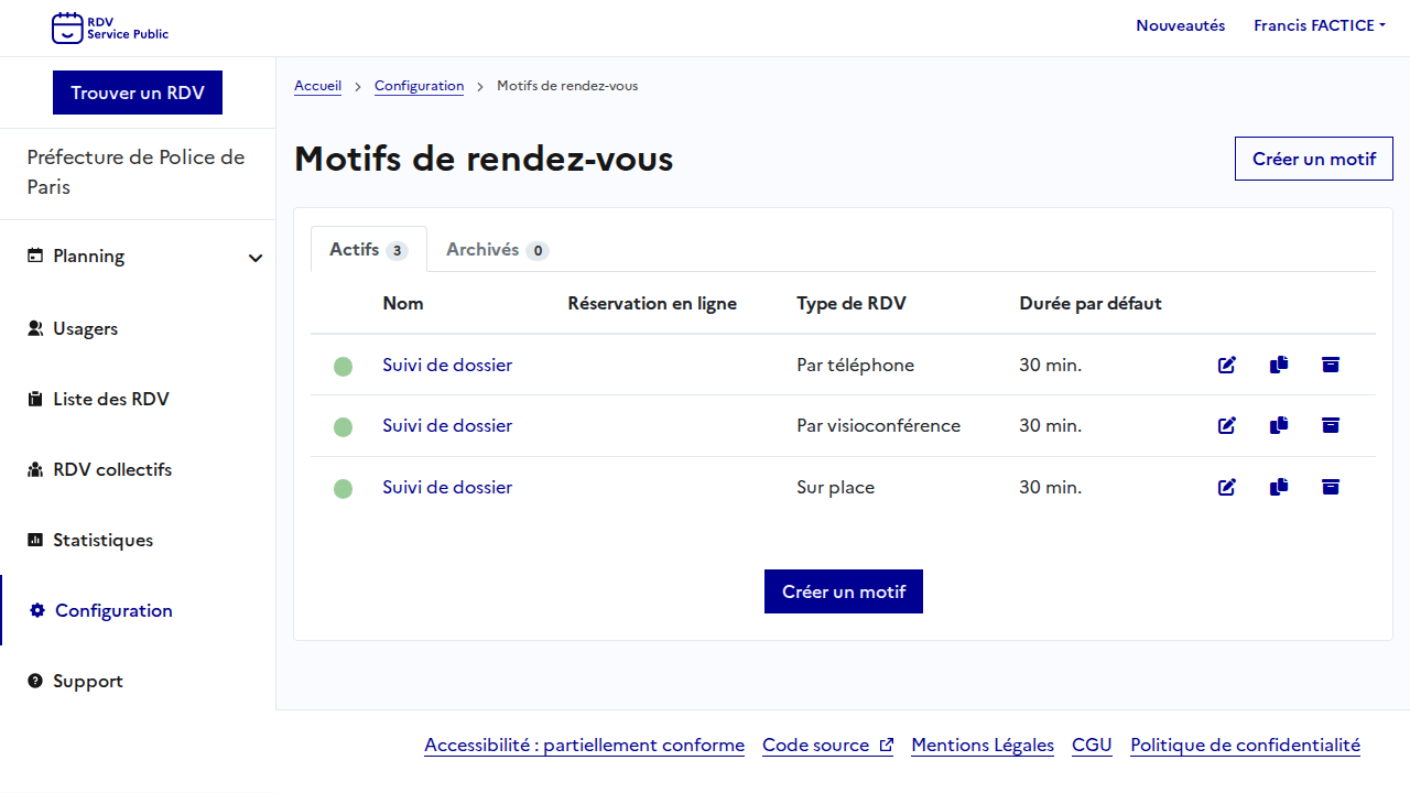 Ces trois motifs me permettent de proposer des rendez-vous sur place, par téléphone ou par visio. Je peux archiver ceux qui ne me sont pas utiles, les renommer, ou en créer des nouveaux.